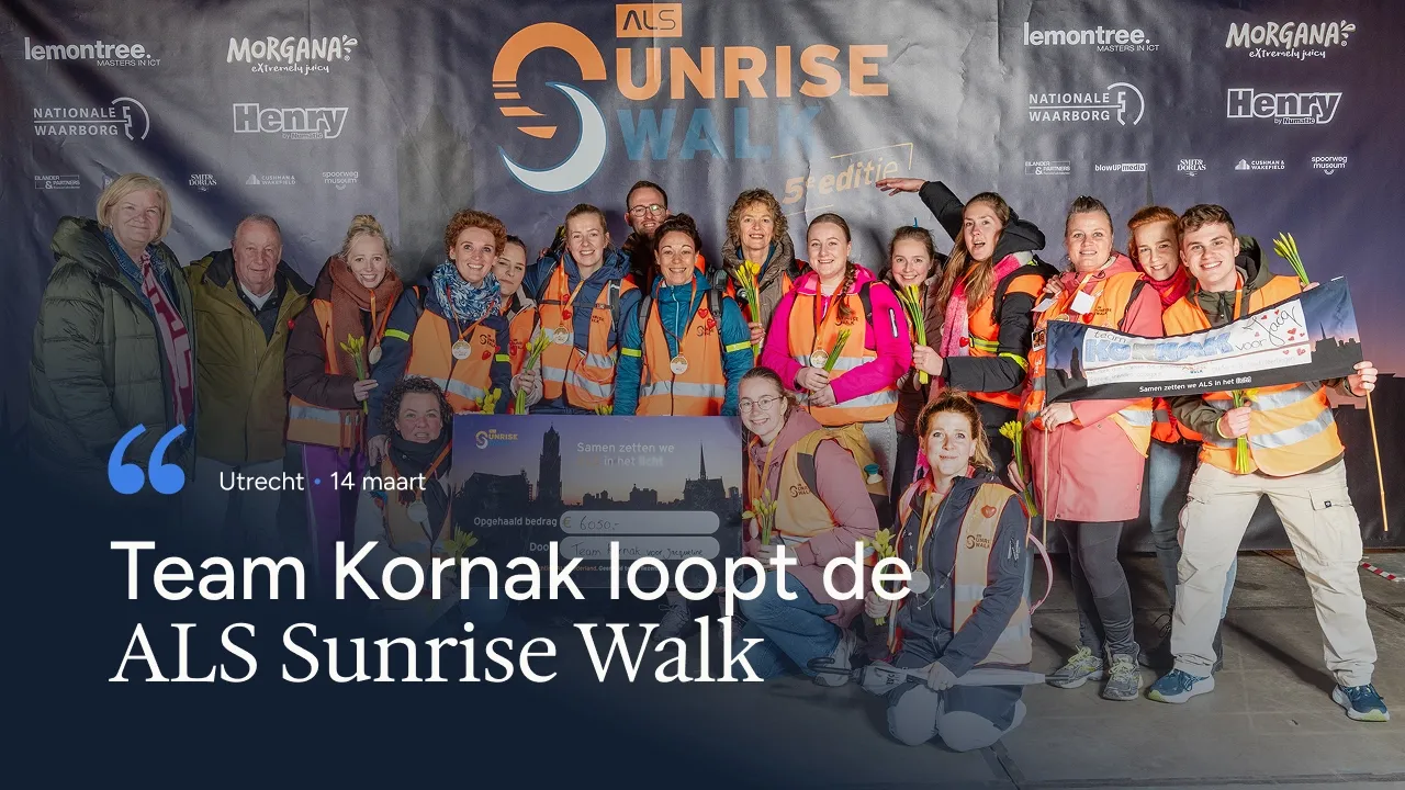 UTRECHT - Basisschool Kornak liep afgelopen zaterdagnacht de ALS Sunrise Walk. Juf Jacqueline overleed afgelopen oktober aan de gevolgen van ALS. Team Kornak wil er alles aan doen om de ziekte ALS de wereld uit te helpen. Tijdens deze wandeling van vijftien kilometer lopen zij de ochtendzon in om de ziekte ALS in het licht te zetten. Op deze manier probeert het team een bijdrage te leveren aan onderzoek naar deze verschrikkelijke ziekte.
