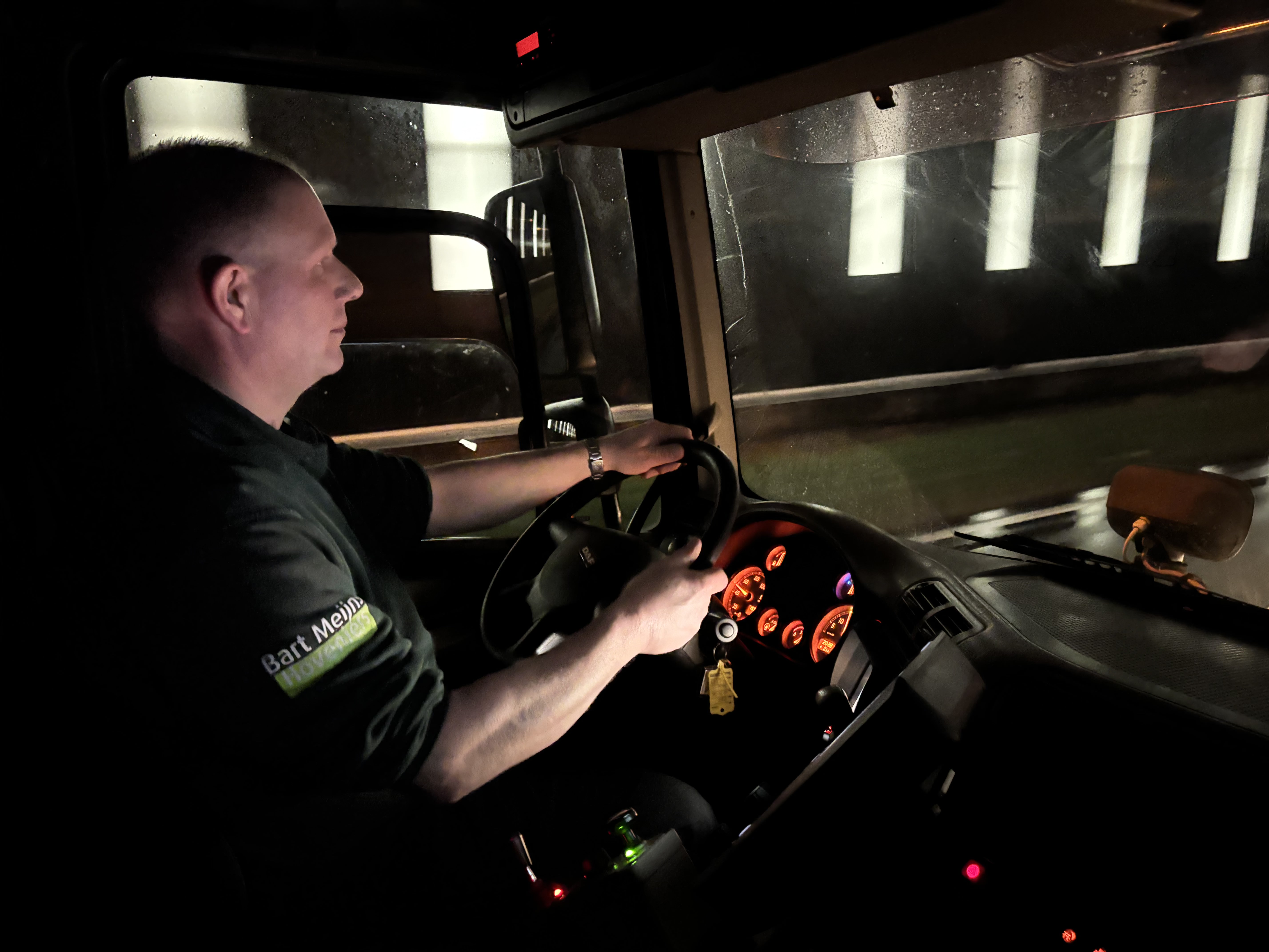 Het is half negen en we zijn een kwartier onderweg. Het is rustig op de weg, maar dat heeft een reden. ’’Je hebt natuurlijk altijd te maken met het andere verkeer op de weg. Daarom proberen we vaak vroeg te beginnen, zoals vanmorgen om 4 uur’’, aldus Meijns. ‘’Dan is het een stuk rustiger met particulieren en hebben we alleen het vrachtverkeer.’’ Maar dat is geen probleem voor hem. ‘’Normaal werk ik overdag, maar in deze winterperiode is dat anders. Dan moeten we met z'n allen zorgen dat alles geregeld is. Maar met die jongens onder elkaar is dat ook wel weer gezellig.’’